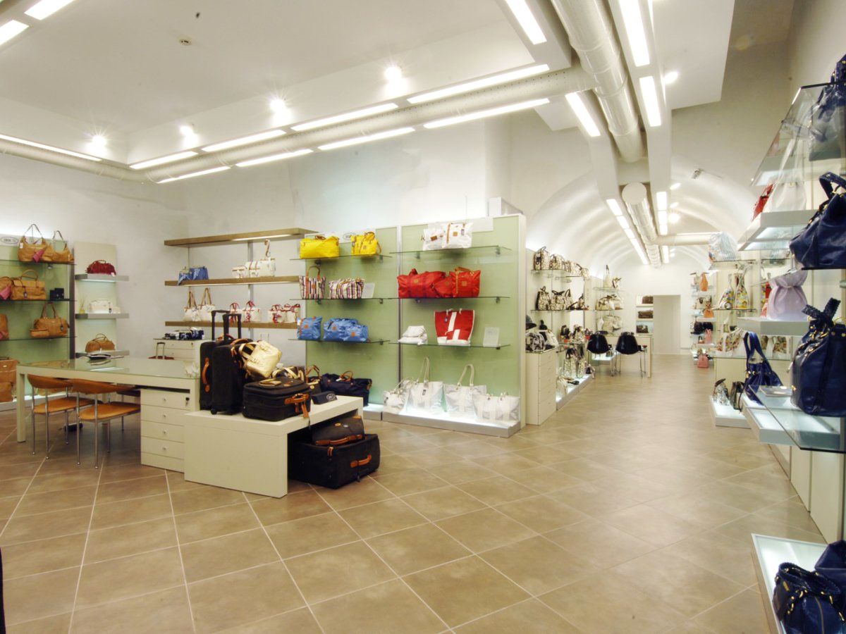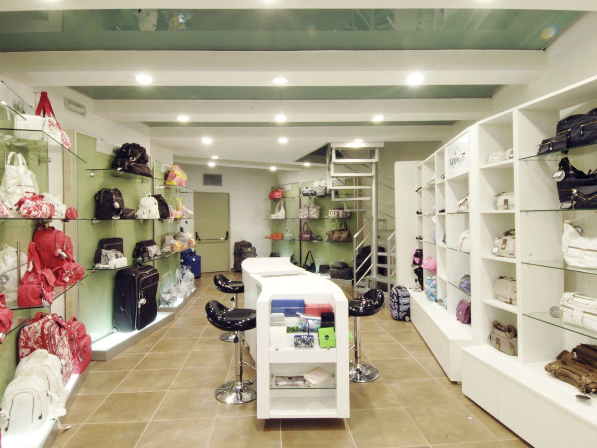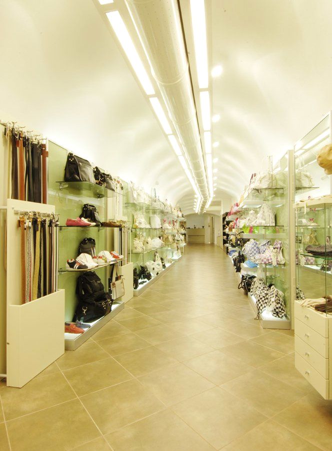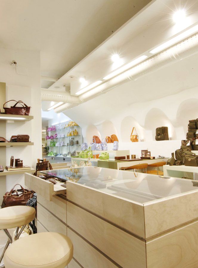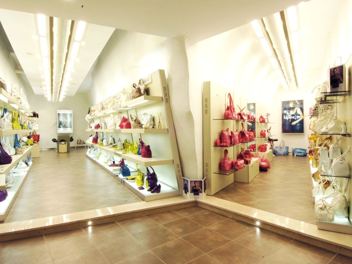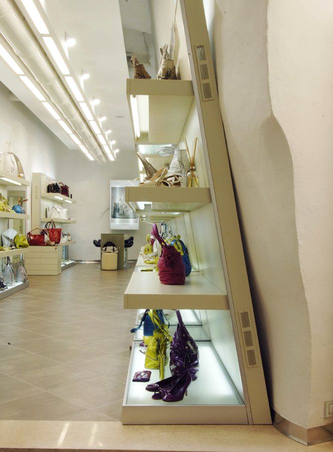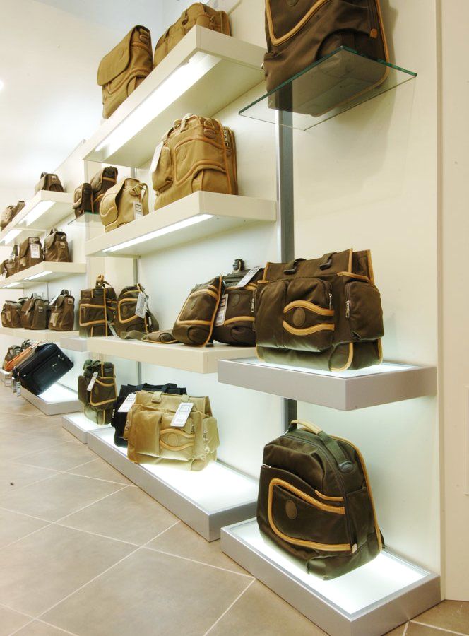 - В каждом отделе магазина своя подсветка и свое оформление. Женские сумки – на воздушных стеклянных полках со стальными полкодержателями, мужские – на массивных полках из МДФ. Все полки простые, чтобы было максимально удобно брать товар.