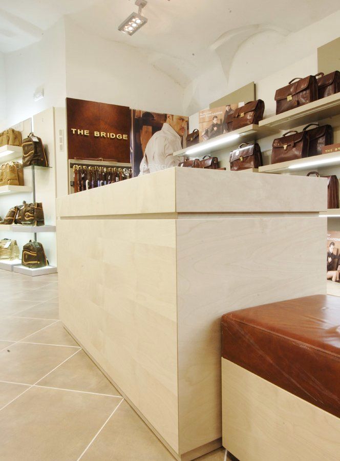 - Оформили островки для демонстрации других кожаных аксессуаров: это разноуровневые столики, тумбы, волнообразные стойки – в каждом зале свое решение.