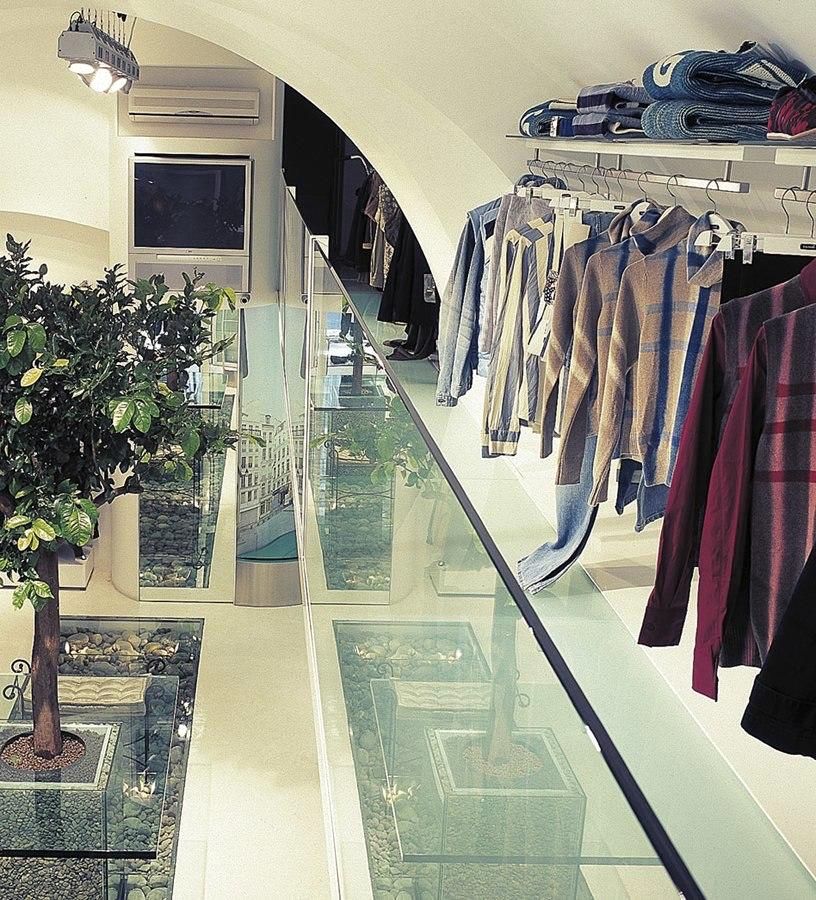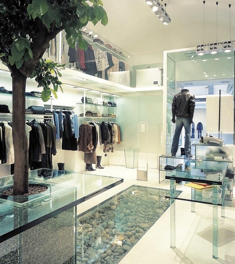 Culpado – итальянский магазин, в котором совместили высокие технологии и частичку природы. Это проявляется в изобилии стеклянной минималистичной мебели и в стильном декоре с использованием камней и высокого дерева в центре.