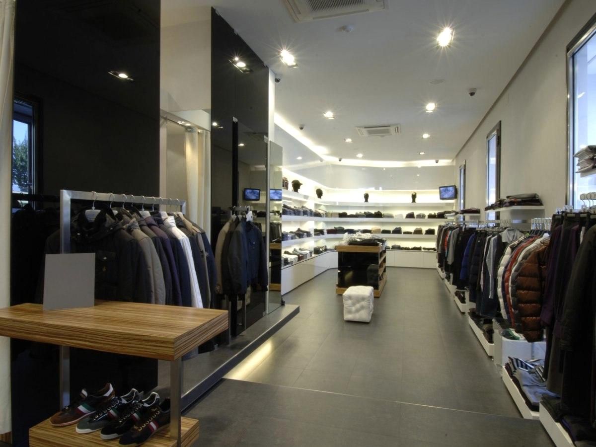 Магазин мужской одежды из будущего – именно таким хотел видеть владелец свой бизнес. Поэтому было решено использовать минималистичные формы и много параллельных линий.