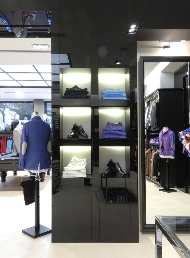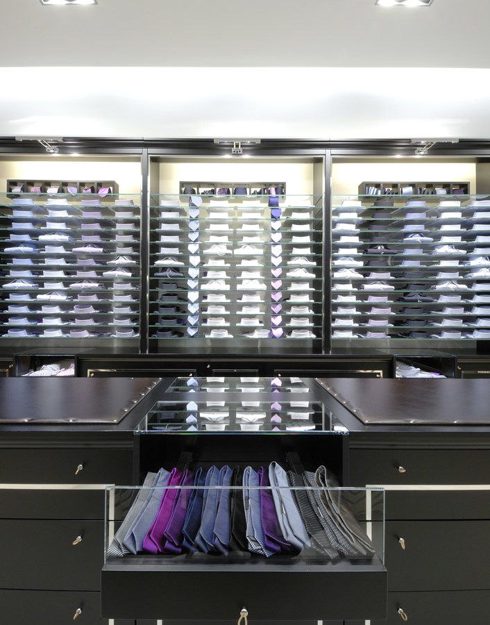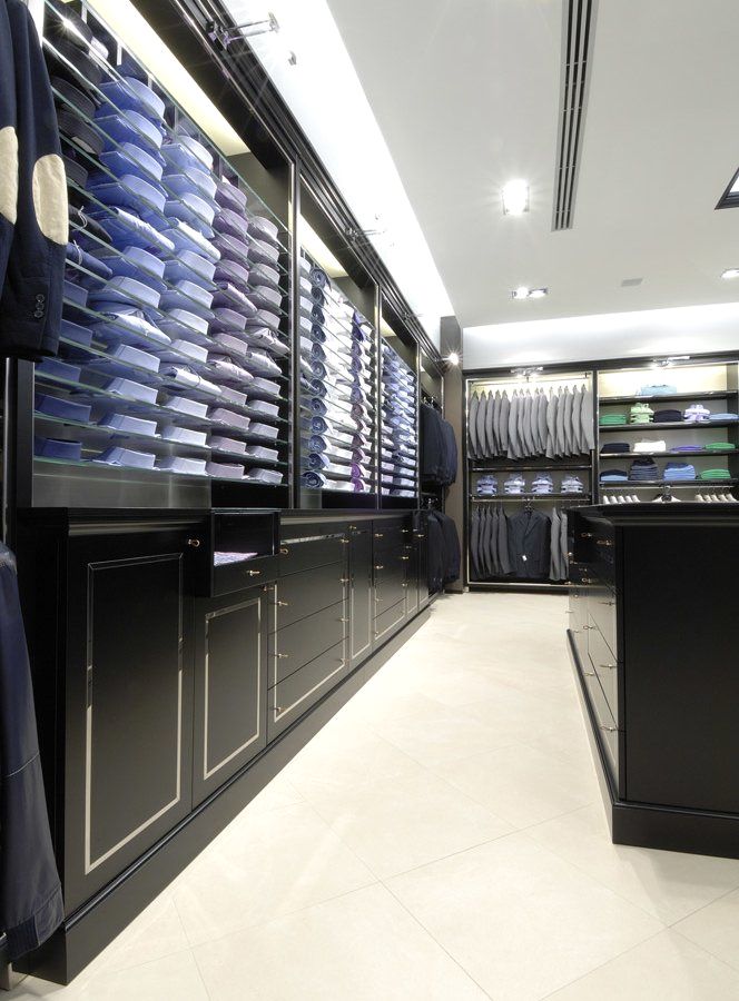 • Организовали много симметричных полок для демонстрации рубашек. Чуть – ниже шкафчики для хранения прочего запасного ассортимента.